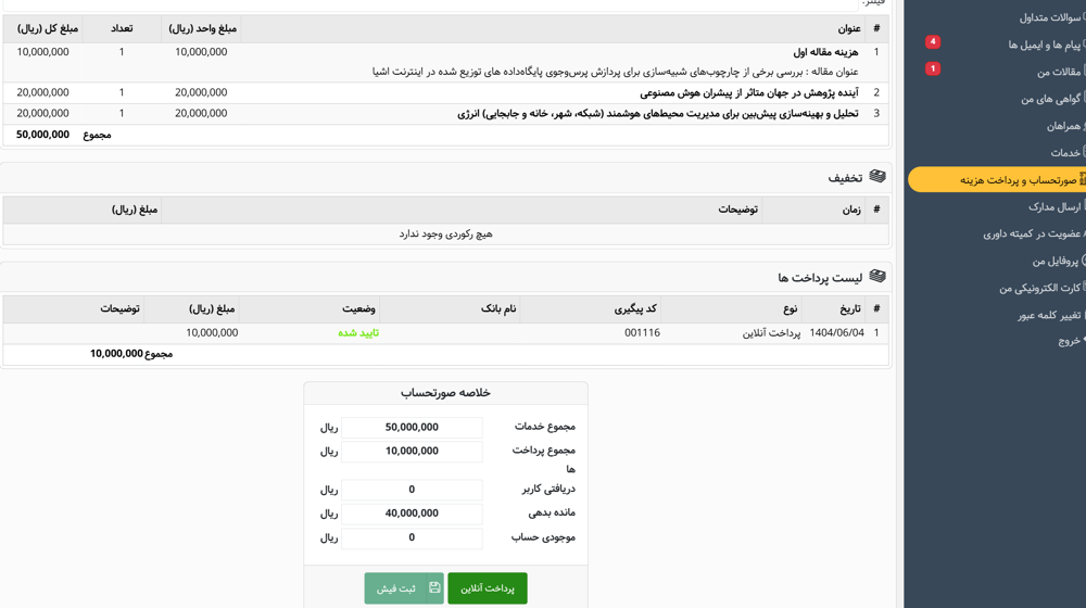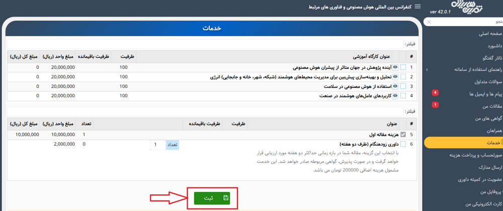 4- پس از ثبت کارگاه های درخواستی، مبلغ کل خدمات در قسمت مربوطه قابل مشاهده است. پس از ثبت کارگاهها و مشاهده هزینه مجموع خدمات، بر روی گزینه آبی «صورتحساب و پرداخت هزینه» کلیک کرده تا به صفحه صورتحساب هدایت شوید. در صفحه صورتحساب و پرداخت هزینه میتوانید خلاصهای از لیست خدمات انتخابی و مجموع هزینههای خدمات انتخاب شده را مشاهده نمایید. در صورتی که قصد تغییر خدمات انتخاب شده را دارید، میتوانید از منوی سمت راست، قسمت خدمات را انتخاب نموده و انتخاب خود را تغییر بدهید. پایین صفحه، خلاصه صورتحساب وجود دارد که کاربر میتواند آن را مشاهده نماید. پس از مشاهد خلاصه صورتحساب بایستی اقدام به پرداخت نمایید.