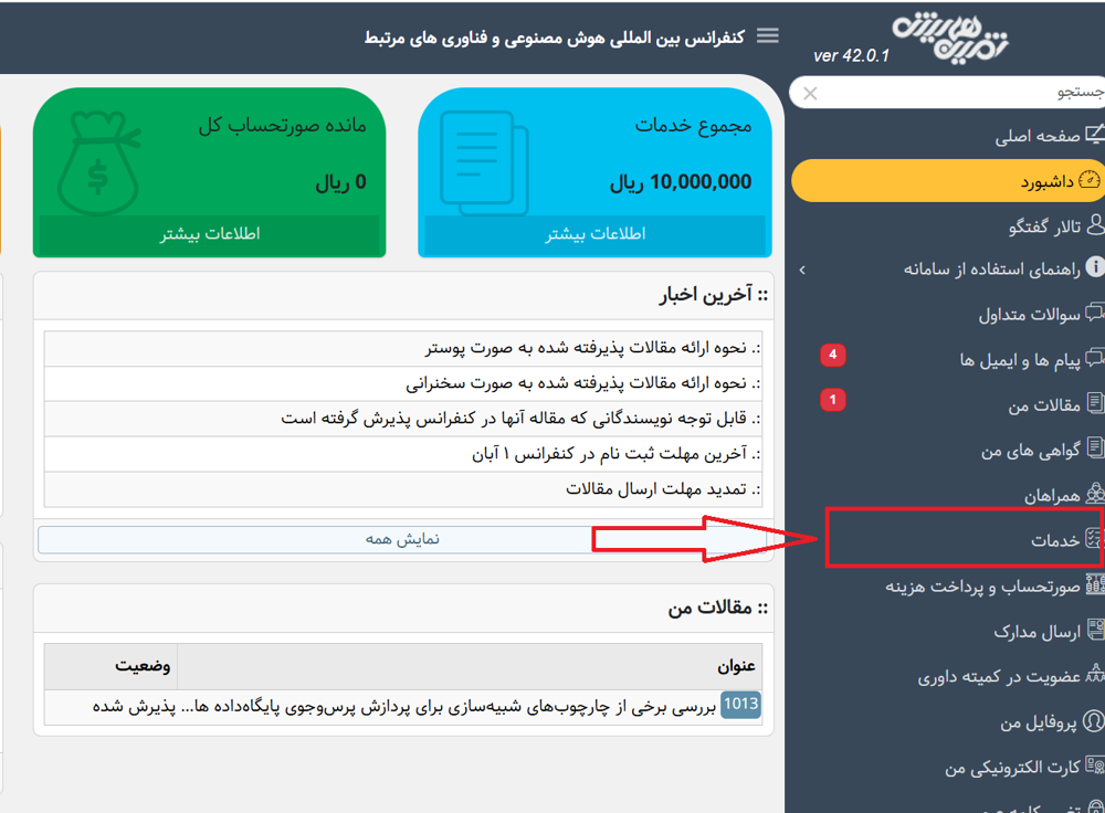 2- در پنل کاربری، در منوی سمت راست، بر روی «خدمات» کلیک کنید.